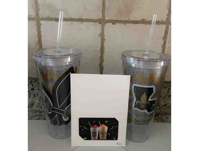 You are bidding on two large New Orleans Original Daiquiri insulated tumblers with Fleur de Lis and Louisiana and a $25 Gift Card to New Orleans Original Daiquiris.
