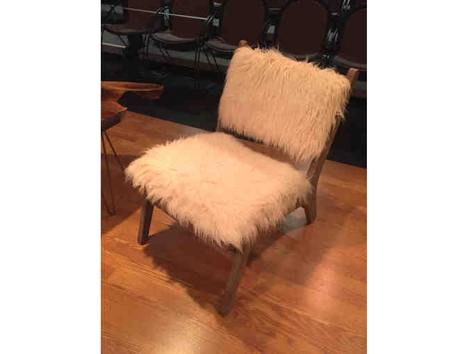 This cozy accent chair is co-starring in our current production of THE CALL and features an exposed elm wood frame with a distressed gray wash finish and soft faux flokati upholstery for a boho-chic look.