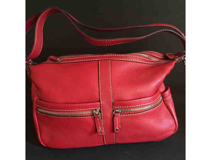 Red pebble leather handbag 12" wide 8" tall. Two outside open pockets on one side, four packets on reverse side (2 zip, 2 open pockets). Interior - wide zip pocket on one side, two open pockets on opposiet side.