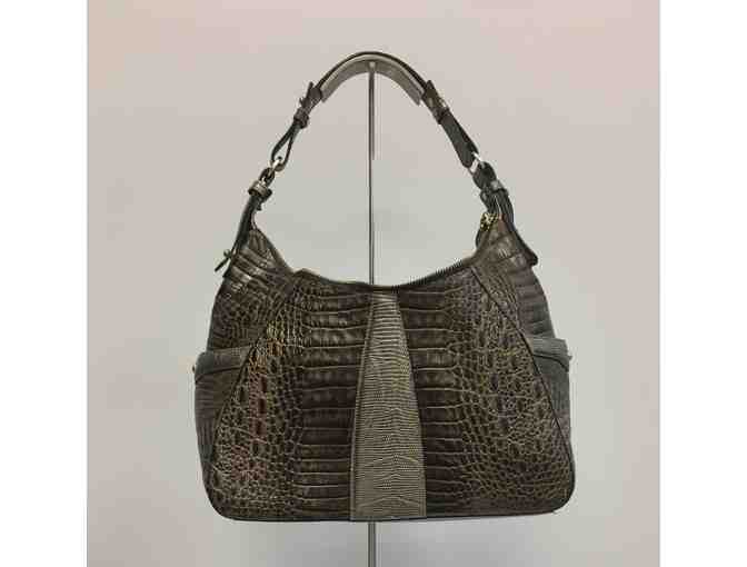 Brahmin medium sized purse has an alligator leather exterior. Measures 11.5 in l x 7.5 in h x 4.75 in w.
