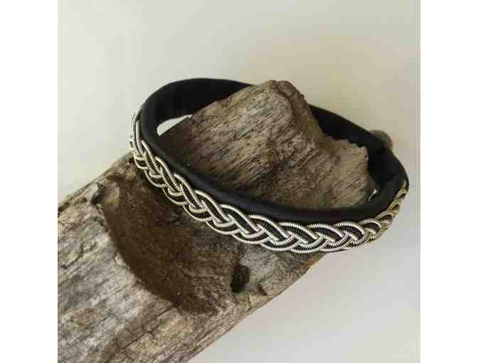 Since the 17th Century, the Samis have used gold, silver and bronze thread for embroideries, primarily on ceremonial garments. Although inspired by the old tradition of pewter thread embroidery, this unique bracelet is a contemporary example of the ancient Sami handicraft.