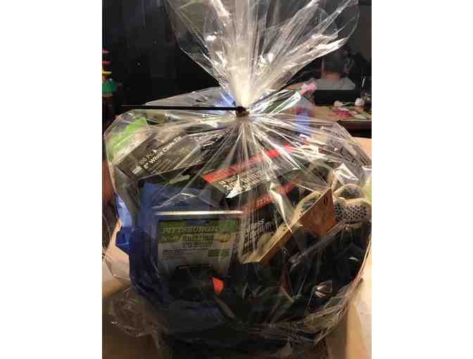 Tool Gift Basket includes cordless drill, drill bits, tape measure, work gloves, and other