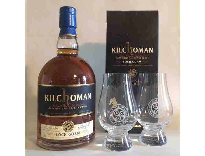 750ml bottle of Kilchoman Loch Gorm Islay single malt scotch whisky and two branded glencairn glasses. $120 value.
