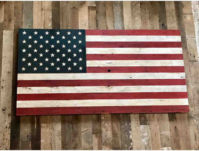 This 40" x 77" Custom American Flag is made from 150 year old reclaimed white oak wood from a textile factory out of Ohio.