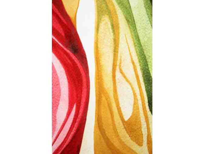 This watercolor expression by local artist educator, Christopher M. Strickland, is aptly entitled "Passage", as it imbues earthy and organic tones of reds, yellows, and greens to abstractly detail the composition space and area. The resulting imagery induces a geographical or anatomical effect.