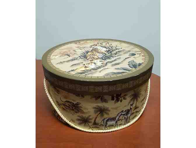 Beautiful round hat box decorated with jungle animals, perfect box to store you hat, scarf's, or delicate items.