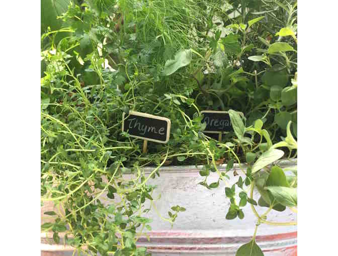 Garden featuring 5 fresh herbs planted in a large galvanized tub. Donated by Niki Epstein, New Orleans Based Landscape designer.