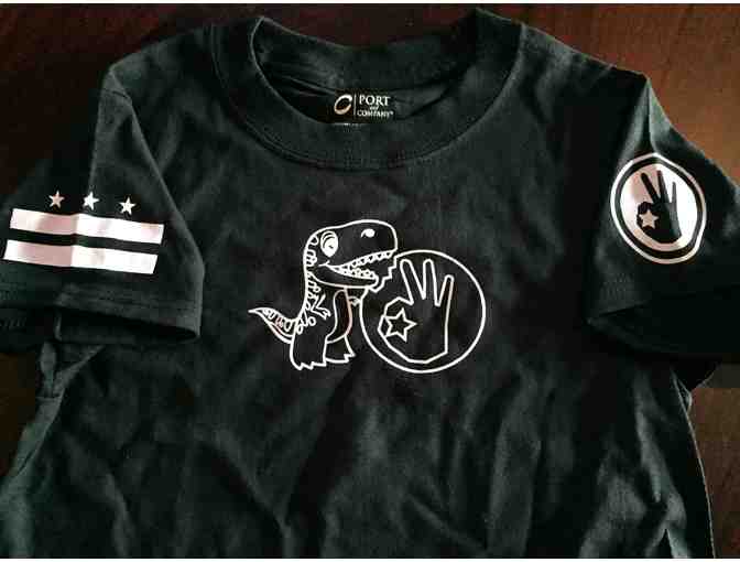 Simple Bar & Grill DC-themed children's clothes: 1 small t-rex t-shirt, 1 small rhinocerous t-shirt, 1 3-6 month onesie