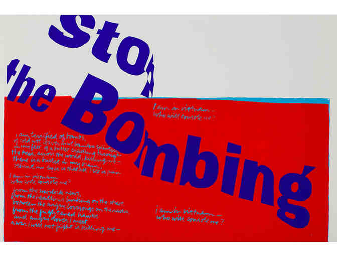 Protest Banner, red and blue, made to resemble a waving flag, accompanied by quotes.