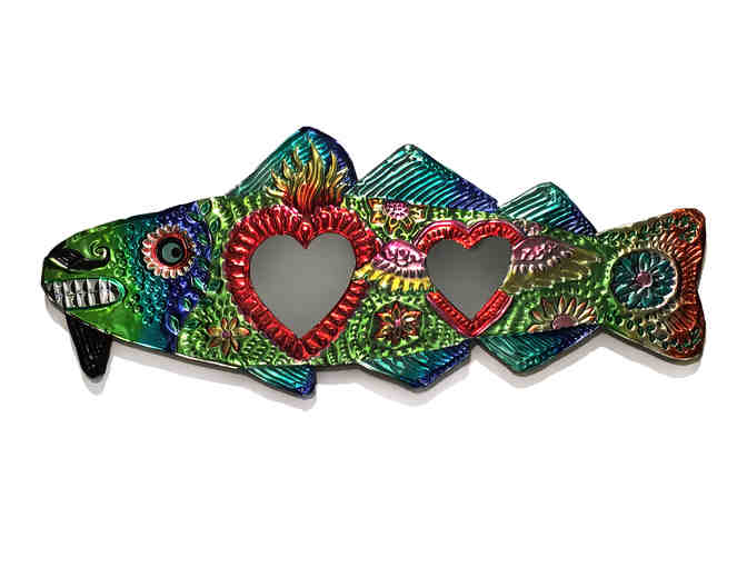 Artist Statement:  This Cod is inspired by Mexican tin art designs and motifs. The metal foil is double-embossed and colored using permanent pens. The mirrors and designs evoke images of Mexican "milagros," small charms thought to bring good luck or health. "Fiesta Fish" is sure to spice up your home's decor—just add some chips and salsa and a nice margarita!