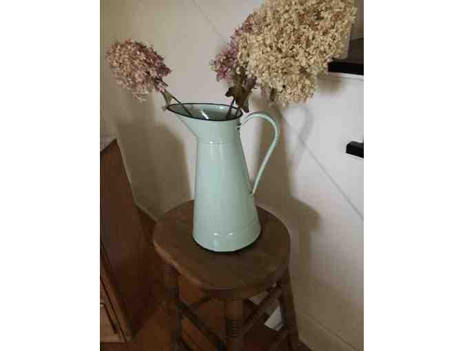 Painted Porch Antiques offers a beautiful enamel pitcher in a soft aqua/ green color and from England, Circa 1900.