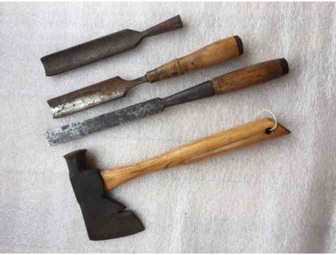 This group of edge tools includes a 19th c. mortise chisel that was made in NH by the Underhill Edge Tool Co. There are also two unmarked carving gouges and a 20th c. shingling hatchet. The hatchet handle is 12"; blade 3 1/2"