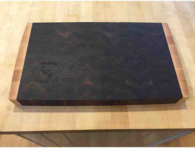 This BEAUTIFUL hand crafted cutting board created by local woodworker Mark Seymour (Seymour Woodworking) is made of black walnut and rock maple. The picture DOES NOT do it justice. An amazing one-of-a-kind addition to any kitchen!
