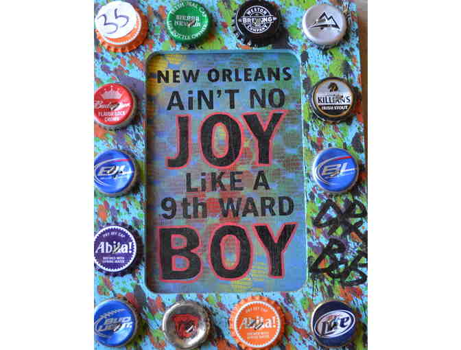 Bob Shaffer, called Dr. Bob after he delivered his only son, was born in Kansas but grew up mostly in Louisiana. He began his art career as a sculptor who worked on Wilkinson Row in the French Quarter. Shaffer moved to his current Bywater studio on Chartres Street in the 1990s. On most days, you can find him in his spacious studio and shop painting his familiar slogan or whimsical scenes of the city or Louisiana wildlife, especially alligators. He creates his pieces on found materials, including Hurricane Katrina detritus, old ironing boards, trash can lids, coffee cans and more. He adorns many of the frames with old bottle caps. Shaffer says, "Ya gotta have soul and use real stuff" to be a good folk artist.