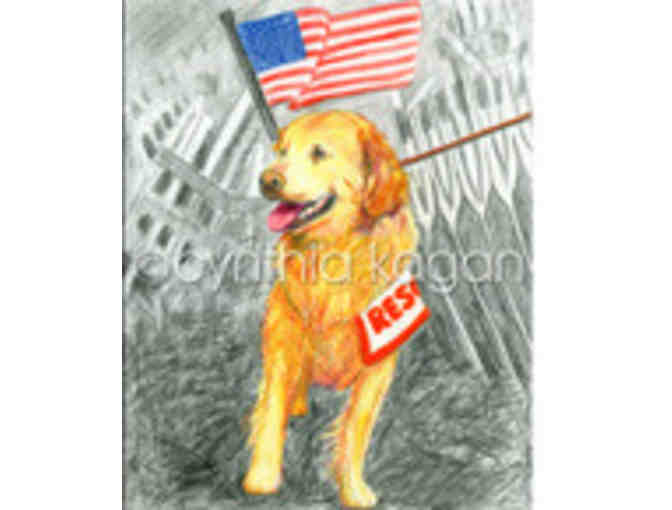 Essence Of America 9/11 Tribute Series: In response to the tragic events of September 11, 2001, artist Cynthia Kagan created "The Essence Of America Tribute Series to honor the heroism of the many Search and Rescue dogs, and their human handlers, who worked tirelessly at Ground Zero. Several of these brave canines perished in the line of duty during this disaster. The Series genesis aimed to shine a spotlight on these undaunted animals doing the jobs for which they were trained and committed. Captured amidst scenes of mangled armatures, endless rubble and devastation, they embody the unfailing bond of human and canine. The triptych met with an overwhelming response allowing for the creation of a Heroes Fund to benefit the NYPD K-9 Unit. Monies generated from the sales of The Essence Of America" enabled the Unit to acquire and train new canines, renovate and expand the existing facility, purchase a state-of- the-art agility course and pay for new kennels. The Tribute Series is a Limited Edition of which 1000 each was printed in 2001. There will be no further reproduction.