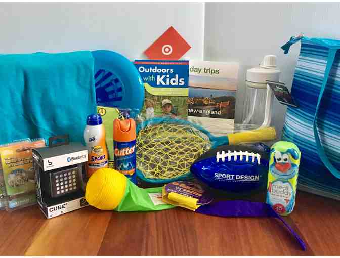 This item includes a cold pack cooler bag, $10 target gift card, football, TWO guide books, frisbee, games, a water bottle, beach towel, portable blue tooth speaker, bug repellent and a first aid kit.