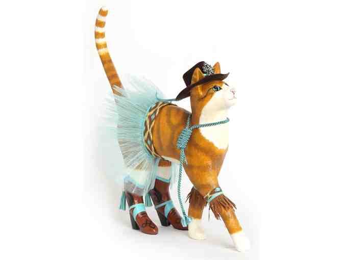 Joan wanted to create a Colorado kitty inspired by old west images. What came to mind was the 1965 classic western movie “Cat Ballou.” Joan also incorporated images of Jane Fonda as a cowgirl outlaw, temptress and convict (much of the movie was filmed in Colorado).