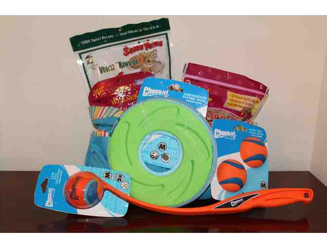 Beth Ann Sabo, Certified Professional Dog Trainer and Certified Nose Work Instructor has put together a fantastic bag of canine goodies for your favorite pup.  The goodies include a Canine Amphibious Disc, a Canine Hardware Chuck-it, Canine Hardware Chuck-it Ultra Balls (medium), Charlee Bear Treats, Wellness Petite Treats, Sam's Sweet Potato Chewz, all in a practical, attractive bag