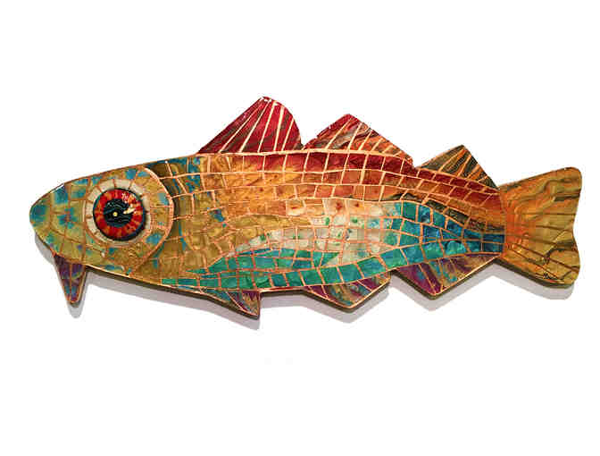 Artist Statement: Elemental Fish was great fun to design and execute! Textural paints were used to create a magical mosaic fish of flowing fire, air, earth, and water hues. Once again I'm thrilled to contribute to the Cod Auction to support the Marblehead Festival of Arts!
