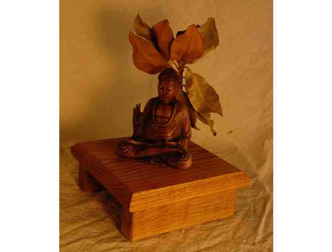 This home altar platform was handcrafted from re-purposed oak by Abbot Elliston. It is a beautiful piece. The re-purposed oak's thickness gives the feeling of solidity while being a living example of finding purpose and beauty in what might otherwise be overlooked or discarded. (The display sample Buddha statue is not included.)