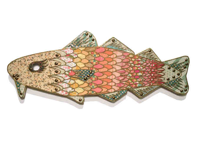 Artist Statement: Whether working in painting, collage, or printmaking, Groeber's art focuses on identity and the friction that exists between the surface of our experiences and our complex pasts. In "Fins & Pins, Scales and Tails," Groeber painstakingly collages layer upon layer of gold-tipped paper scales in whimsical patterns that act as evidence of this fanciful cod’s history. Brass brads and layers of smooth varnish add to the rich surface display.