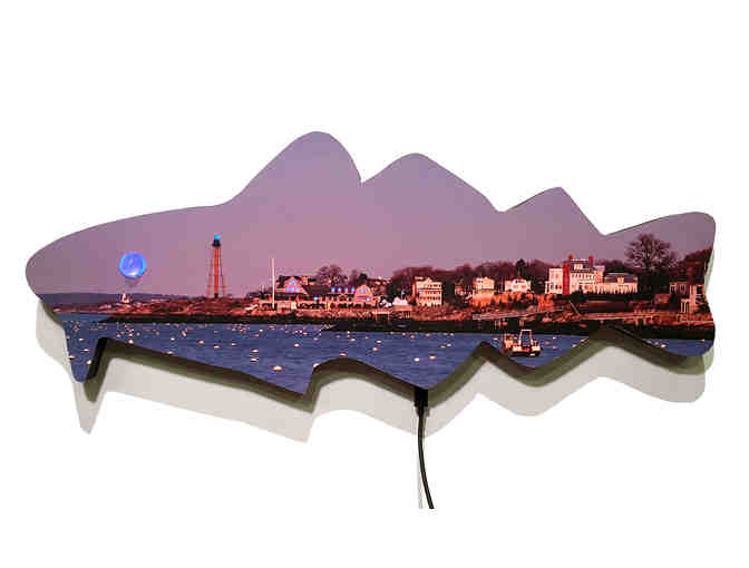 Artist Statement: A talking COD? Yes. A COD that can answer questions? YES. A visually appealing landscape photo of Marblehead Harbor at dusk, adorned with a glowing moon and points of light, and equipped with artificial intelligence that can give you answers to specific questions. What's the weather today in Marblehead? What movies are playing at Warwick Cinema in Marblehead? Now THAT'S a smart COD.