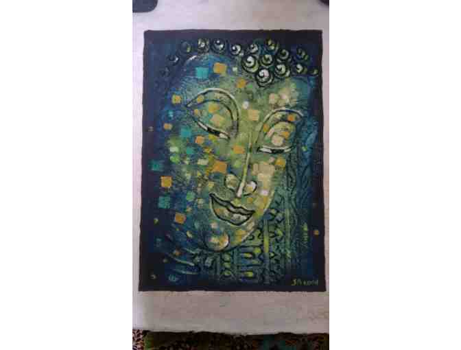_”Green Buddha” is an original painting on special handmade paper canvas. It was created by S.A., a Buddhist artist from beautiful Luang Prabang in Northern Laos. Dimensions 15 x 21inches