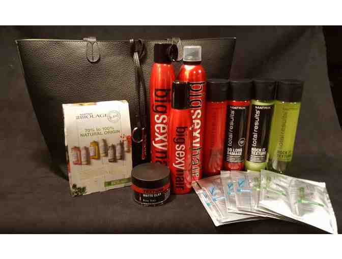Owner Rhonda Quici has put together the perfect collection of Matrix Total Results products in a beautiful black tote bag. The collection includes shampoo and conditioner in the Damaged Hair Formula and the Volume Formula, the following Matrix Big Sexy Hair Products: Spray and Play Harder Hairspray, Big Altitude Mousse, Matte Texture Clay, and Root Pump Plus Volumizer, plus Matrix Biolage R.A.W. Natural Origin shampoo, conditioner, and oil mist.
