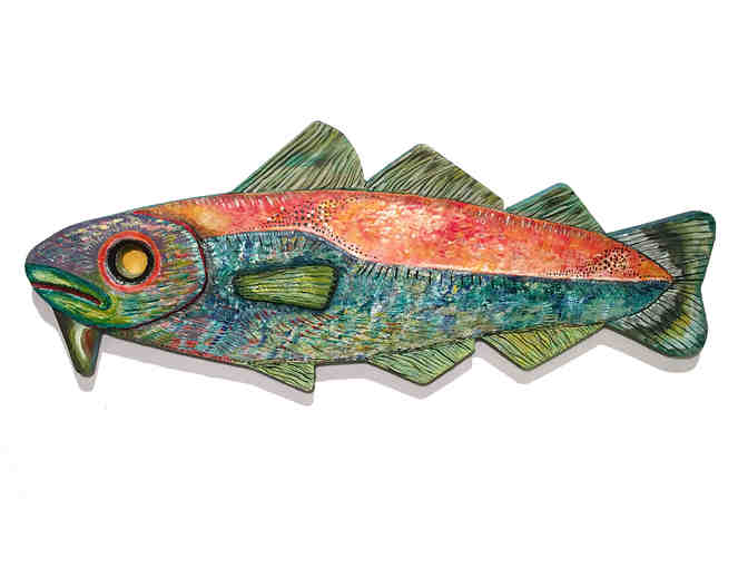 Artist Statement: I'm a 3D artist by nature. I LOVE color and adore painting, but I find it much more satisfying to apply color to 3-dimensional forms than to flat surfaces. Hence the addition of paper clay to the formerly flat wood cod. Never heard of paper clay? I hadn't either, until four or five years ago. I'm in love. Think of it as a cross between paper maché and clay. After I've mixed the fluffy white material with water, I have about 20 minutes to work with it before it begins to harden. Once fully hard, the material can be sanded, filed, drilled, sawed—essentially anything one can do with wood. And, of course, the 3D surface is available to decorate in any way I like. FUN!
