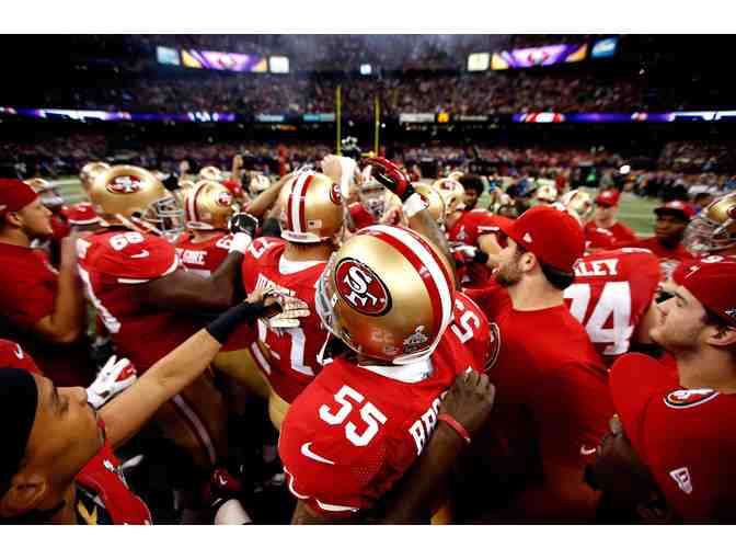 Game choices are 9/21/17 v. LA Rams; 11/5/17 v Arizona Cardinals; 11/12 v NY Giants; 11/26/17 v Seattle Seahawks; or 12/17/17 v Tennessee Titans. Seats are section 102, row 25 at Levi's Stadium. Winner must select game date with donor no later than 7/15/17.
