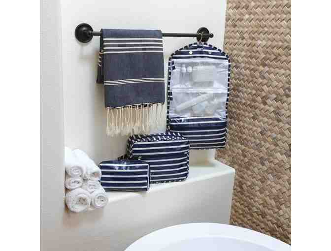 Travel in style with this five piece laminated travel set by Rock Flower Paper. Complete with backpack, hanging cosmetic bag, tote bag, dopp kit, and cosmetic bag, you will have everything you need in this adorable, durable, set!