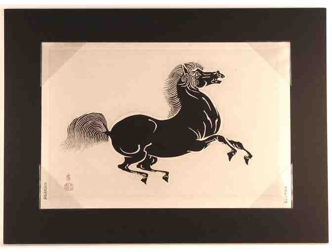Striking woodblock print from famous Uchida Studio of Kyoto (maybe mid 1900). Majestic black horse with exceptional details against white background and black mat. Horses are known to represent strength, energy and health. [Matted approx size 14" x 16"]