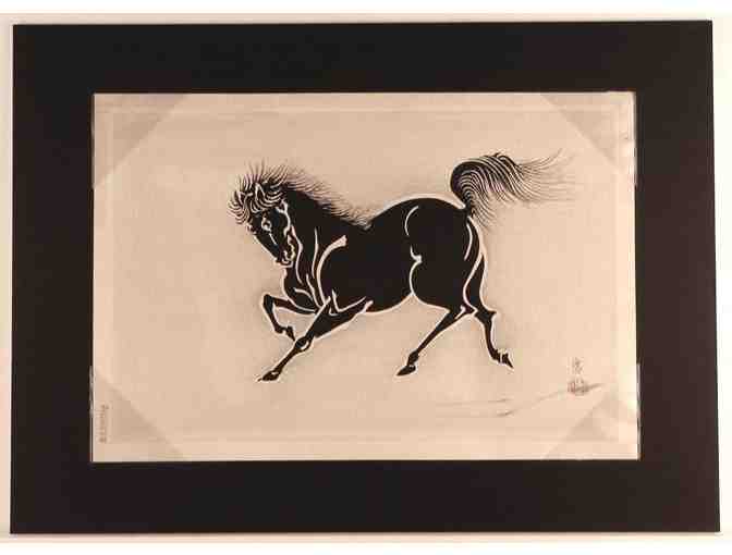Striking woodblock print from famous Uchida Studio of Kyoto (maybe mid 1900). Majestic black horse with exceptional details against white background and black mat. Horses are known to represent strength, energy and health. [Matted approx size 14" x 16"]