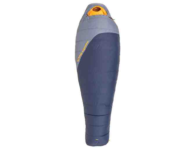 For spring, summer and fall, this women's regular-length boot jack style sleeping bag is lightweight, in navy/flint and zippered on the left side.