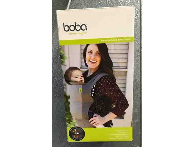 Boba baby carrier, Holli Zollinger collection. Designed for loving happy babies everywhere, fits heights 5' to 6'3", waist range 25" to 58", removable hood, breastfeeding buckle, smartphone holder, sliding chest strap, removable foot straps, integrated infant insert, instruction manual.
