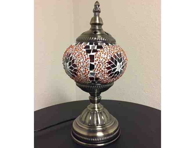 Display this beautiful traditional Turkish lamp in your home. The mosaic glass shade and detailed metal base will impress any guest.