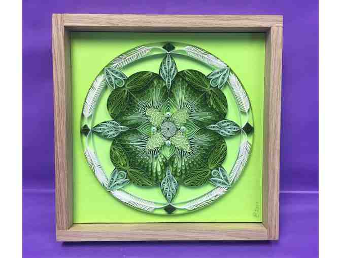 This piece was handcrafted using paper strips by Nancy Pfruender of Quilling Naturally. The picture measures 10"x10" and includes a wooden frame with a loop for wall display.