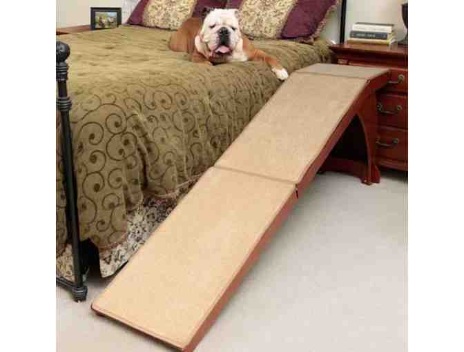 BRAND NEW (still in box) - A gentler kind of boost. When stairs won’t work for your pet, the Solvit Wood Bedside Ramp is an attractive, effortless way to reach even the tallest beds. The Bedside Ramp is the perfect solution for pets unable or unwilling to use stairs to access a bed. Long enough to provide a gentle climbing angle, the Bedside Ramp is still compact enough to fit alongside a queen-size bed with a nightstand in place. The top landing area is generously sized, so your pet will feel confident moving to and from the bed, and the 25-inch height allows easy access to taller beds. A ribbed carpet surface provides sure footing for your pet. The rich, cherry stain and attractive styling complement any décor beautifully. The Bedside Ramp can be easily assembled in about fifteen minutes and cleaned with wood polish and carpet cleaner. The ramp is rated to support 120 lbs. Dimensions:  70 x 16 x 25 inches