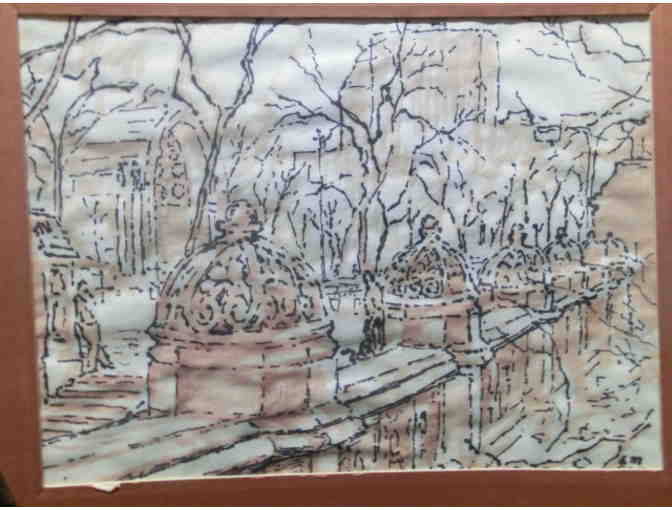ink and color drawing Bridge in Central Park NYC by late NYC artist Evelyn Metzger