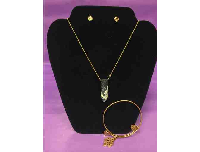 This exclusive Providence Collection contains Endless Knot Earings, Endless Knot Expandable Wire Bangle, and an Earth Sultry Pendant Necklace.