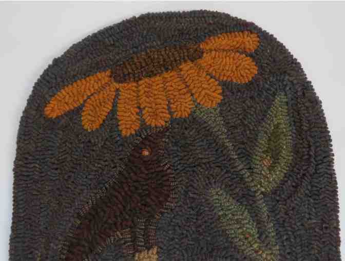 Traditional hand hooked mat, 100% wool fabric on monk's cloth. Pattern by Old Tattered Flag. Design features a crow sitting on a pumpkin looking at a sunflower and was featured in the Fall 2015 issue of Rug Hooking magazine.