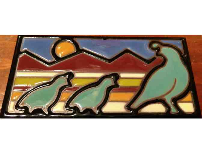 3×6 hand glazed tile with terra cotta background. Cork backed for use as a trivet or wall hanging. Each piece is designed and made 100% by hand from start to finish in our studio in beautiful downtown Tucson, Arizona.