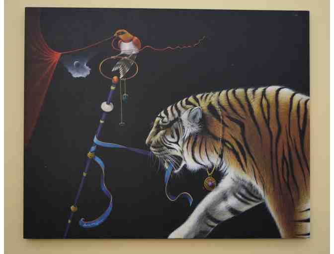 This surrealist-like painting portrays a tiger and parrot pulling a drapery over the moon.