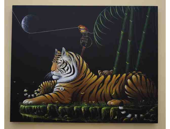 This surrealist painting portrays the importance and majesty of the king of the jungle, a tiger, while an exotic bird has a moon balancing on a string.