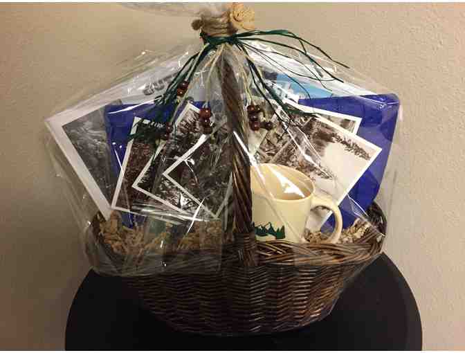 Learn the fascinating history of Shaver Lake in this one of a kind basket! Includes 5 books on the history of Shaver Lake, reusable bag, 5 post cards, pen, mug and shot glass.