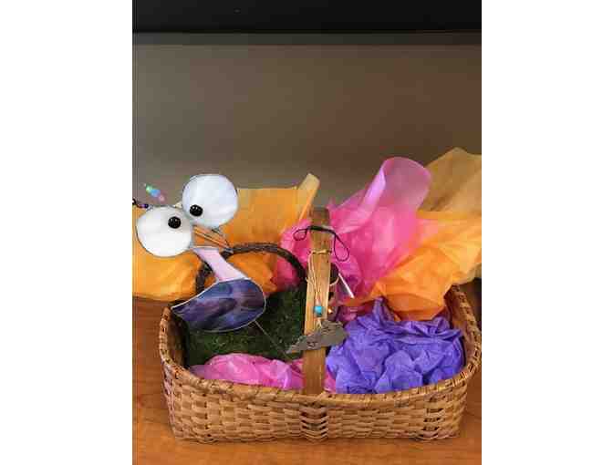 Basket includes an aged hand woven basket, handcrafted glass bird, handcrafted Kentucky ornament, moss purse basket, and handcrafted humming house.