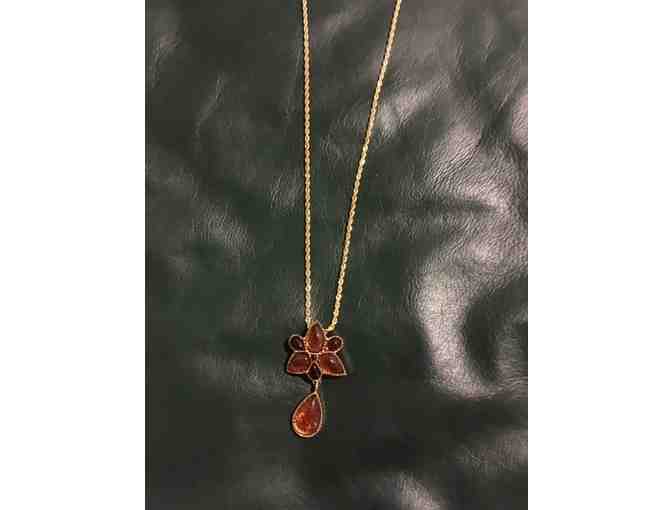 Gold 16 inch thick rope chain with pendant.  The color of the pendant is amber. The pendant can also be used alone as a brooch.