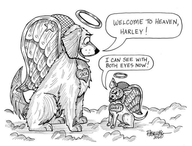 "Welcome to Heaven, Harley" black and white print. Measures 11" x 14". Artwork features old fashioned technique of using lines to create texture and shading.