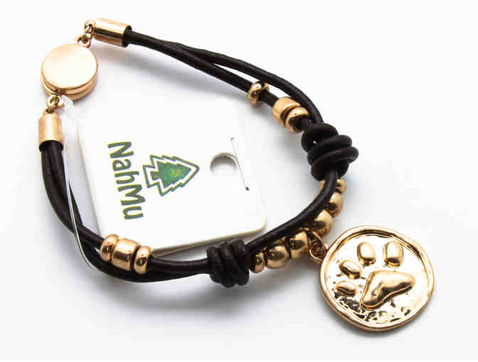 Fine quality, beautiful leather bracelet which includes gold metal beads and a paw print charm. Designed by NahMu.