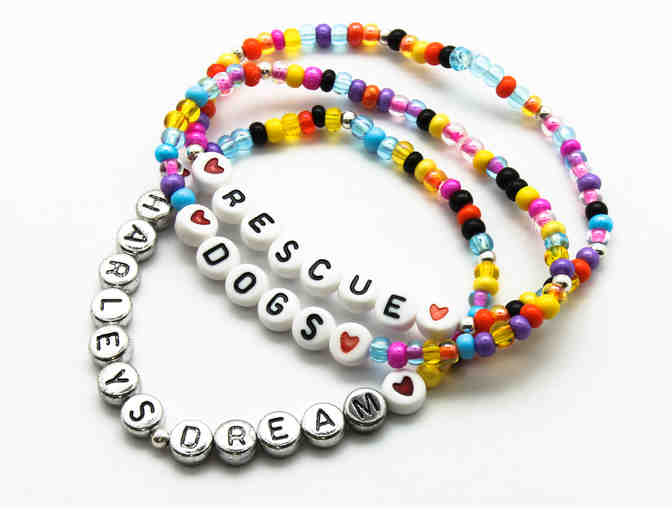Set of 3 cute beaded bracelets, handcrafted. Letters on the bracelets read HARLEY'S DREAM, DOGS, and RESCUE. Colorful glass beads on stretchy cord.